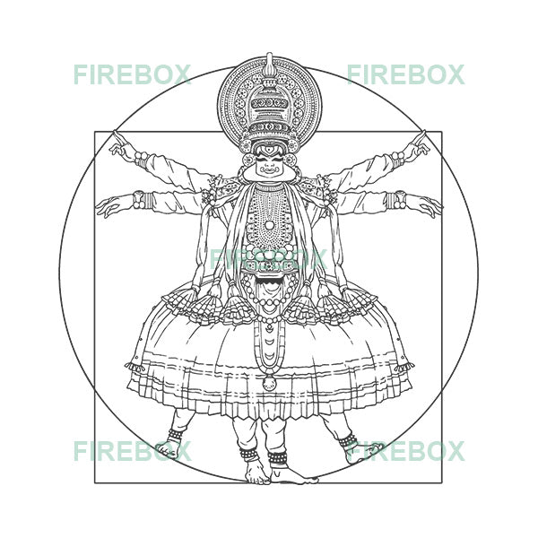 This T-shirt is an ode to both da Vinci's deep understanding of human anatomy and to the iconic classical dance-drama from Kerala. By featuring a Kathakali dancer in the characteristic pose inspired by Leonardo da Vinci's Vitruvian Man, the artist demonstrates how the Kathakali performer’s rigorous physical training and expressive storytelling align with the Vitruvian Man's ideals of bodily symmetry and perfection.