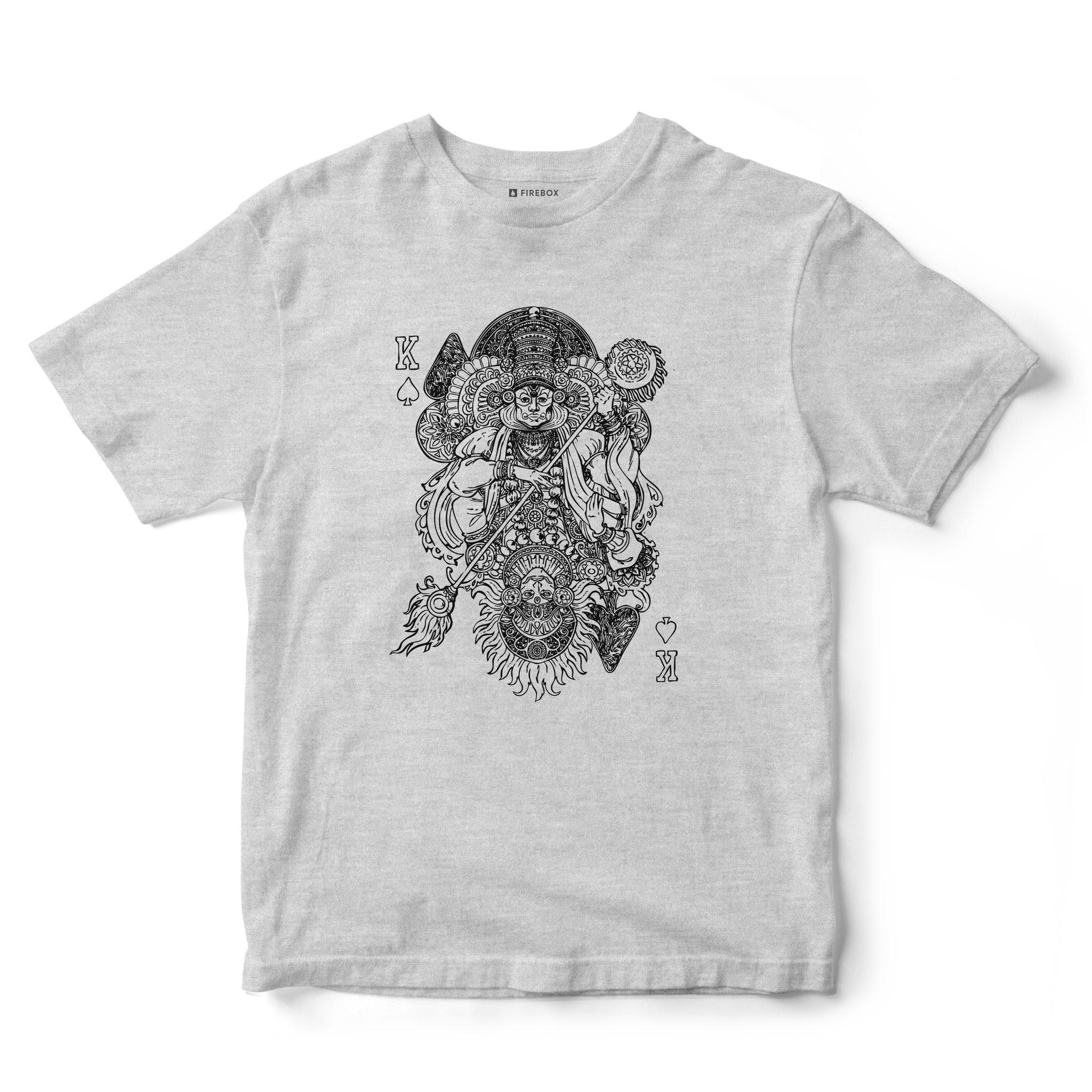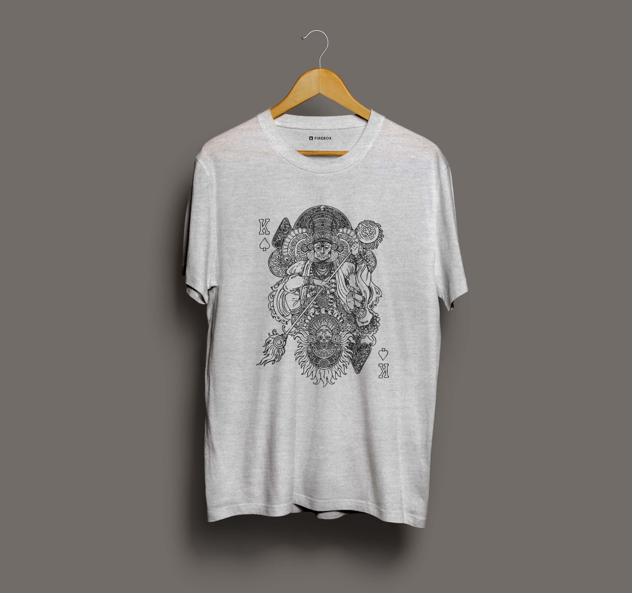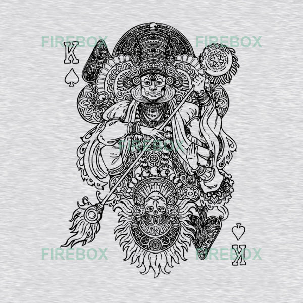 This unique graphic tee brings two iconic Kerala art forms together in a bold playing-card–inspired design. The artwork features Kathakali on the top and Theyyam on the bottom, creating a striking mirrored composition that celebrates tradition with a modern twist. Printed on soft, comfortable white heather cotton, this tee is perfect for culture lovers, art enthusiasts, and anyone who wants to wear a piece of Kerala’s heritage in style.